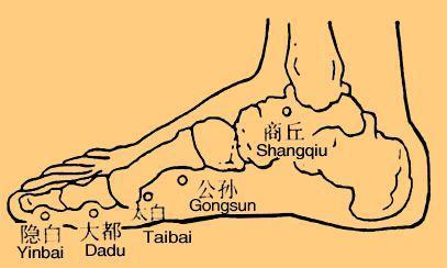 從太白穴往上1寸就是公孫穴。它的功能非常強大,既可以調動脾臟、脾經的運血能力,把血液輸送到全身去,是一個輸送點,一個樞紐;又可以幫助調節身體上由於氣血瘀滯造成的各種症狀,綜合起來,就是通氣、活血、解淤。